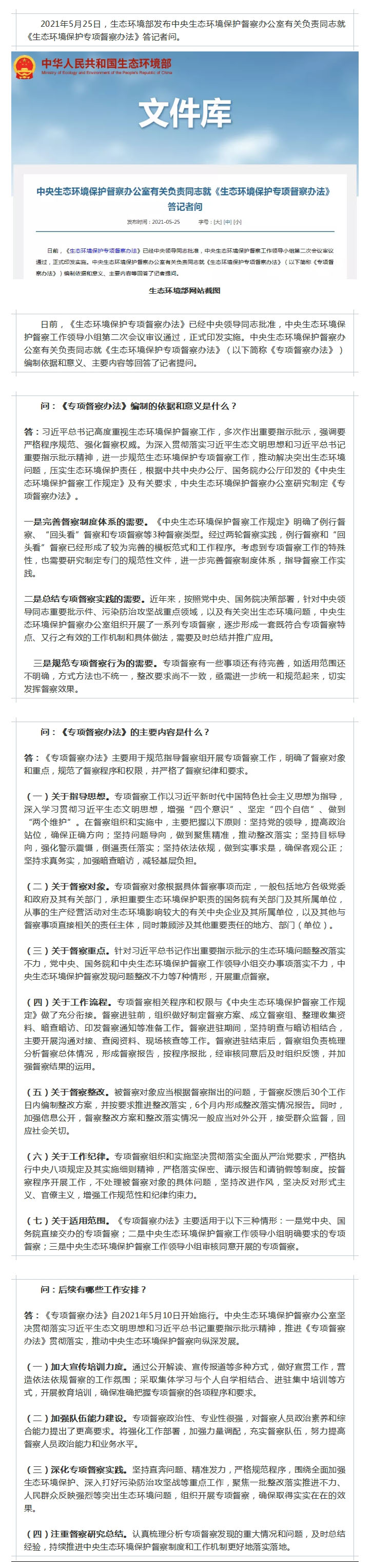 中央生态环境保护督察办公室有关负责同志就《生态环境保护专项督察办法》答记者问