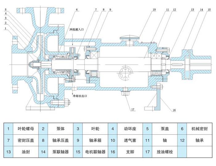 该系统泵为轴向吸入径向排出,径向剖分壳体,泵体底脚支撑,采用闭式叶轮或开式叶轮(含固体颗粒),轴封可根据介质工况选用单端面、双端面、波纹管、集装式或付叶轮填料等多种密封形式,轴承采用圆柱轴承和成对角接触球轴承,柔软膜片膜片联轴器传动,从电机端看为顺时针转动。