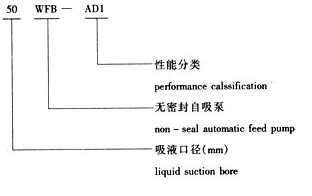 (3)完整的型号书写方式。假设水泵的要求是:造型为推车移动型,材质为增强聚丙烯,吸液口径为50mm,性能分类为AD1。这台水泵的完整型号为“5PP50WFB-AD1”